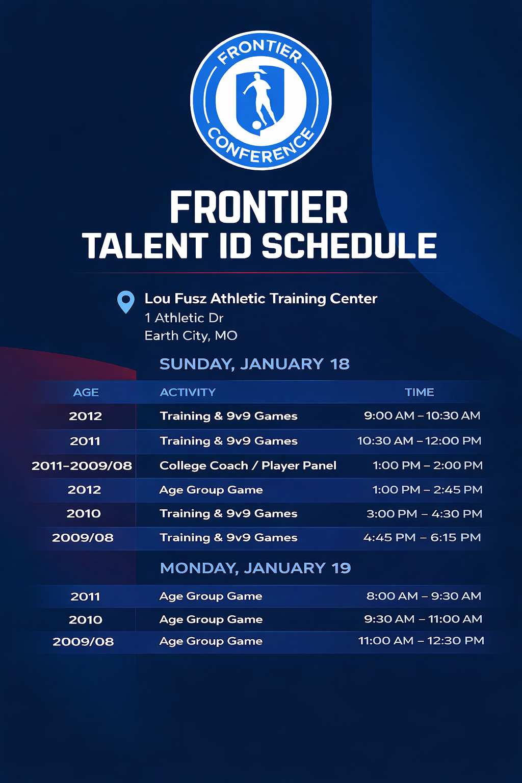 The Frontier Talent ID event, hosted at the Lou Fusz Athletic Training Grounds, will feature some of the top talent the Frontier Conference has to offer. Our mission at Talent ID events is to expose invited players to opportunities where they can succeed at the highest level thanks to classroom sessions, on-field training exercises, and full-game experiential learning. The top players from each conference’s Talent ID event will be invited to participate in National ID crossover matches at National and Regional GA events.